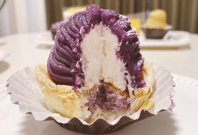 紫色のクリームのなかには、生クリームがたっぷり。芋と生クリームの甘さが絶妙にマッチ。思わず笑顔になる甘さです。