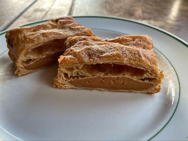 パイを切ってみると、パイ生地が何層にも重なっていることが分かります。中にぎっしりと詰まったキャラメルクリームは、コク深く濃厚な味わい。