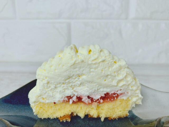 チーズモンブランの中には、つぶつぶとした食感が楽しめる苺ソースと、さわやかな風味のレモンピールが入っています。底部分はふんわりとしたスポンジで食べやすい!