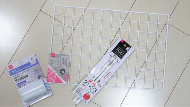 【ダイソー】ワイヤーネット、専用フック、つっぱり棒/各110円(税込)