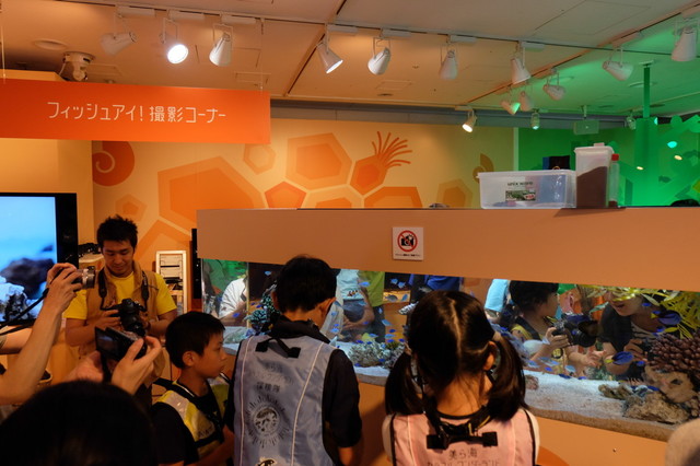 また、ソニーのデジタル一眼レフカメラ「α99」や、ミラーレス一眼「NEX」シリーズを使って、展示されている水槽を撮影することもできます。もちろん、カメラとレンズは貸し出してくれます。水槽を見るお子さんを、お父さんお母さんが撮影して、夏の思い出づくりもできちゃいます。もちろん、魚たちをバチバチ撮影してもらってもかまいませんよ!