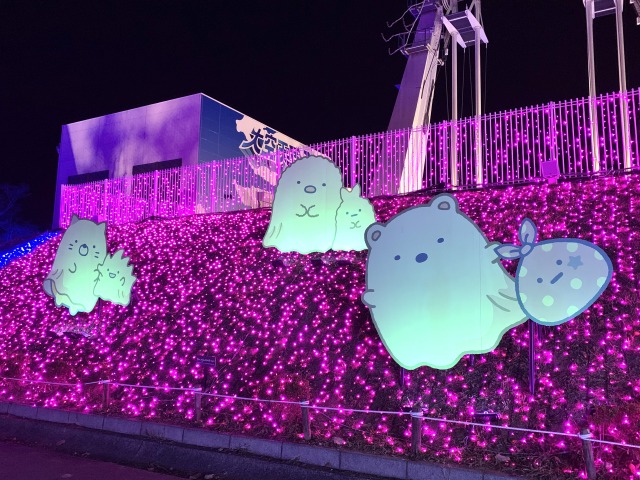 「おばけのナイトパーク」のストーリーで、おばけに招待されて、ナイトパークへ向かうすみっコたちが乗った乗り物を再現したイルミネーションや、おばけに扮したすみっコたちの姿がイルミネーションで楽しめます。
