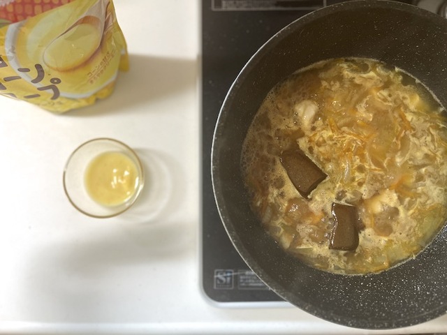 1:大人向けのカレーを作る。ボウルに「おうちスープ コーンスープ」とお湯を入れてよく混ぜ合わせる。