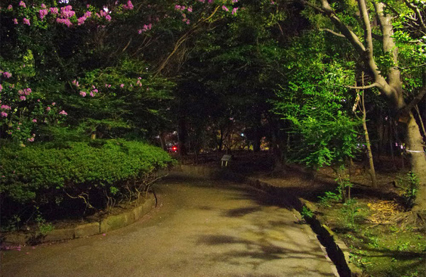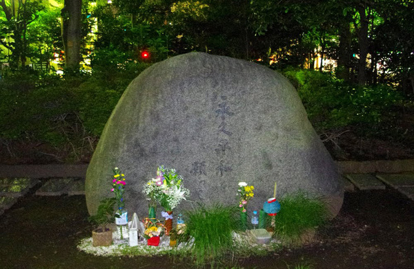 公園につくと、夜遅くに関わらずカップルや若者が思い思いの時間を過ごしていました。本当にここが心霊スポットなのかと訝しげに歩いていると、広場のはずれにその石碑はありました。「永久平和」と書かれ、お供え物が置いてあることから、この場所にダークな過去があったことを連想させます。