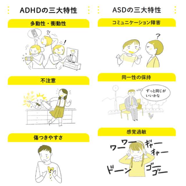 ADHDの3大特性は多動性・衝動性、不注意、傷つきやすさ。ASDではコミュニケーション障害、変化に弱く、ずっと同じがいいと考えがちな同一性の保持、感覚過敏が挙げられます。