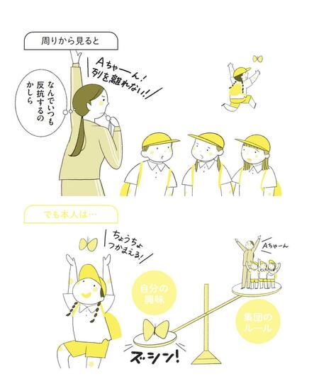 自分独自の世界観を持つAちゃんは、集団で行動しなければという意識が希薄です。遠足中、ふと目に入った蝶々に興味を引かれ、列から離れてふらふらと歩いていってしまうようなことがあります。