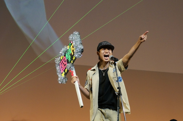 さて、いよいよ開会式。その中で、各校の代表者が自校のプラカードを持ってステージに上がり、マイクに向かって意気込みを一発叫ぶという演出があり、さっそく盛り上がりました。