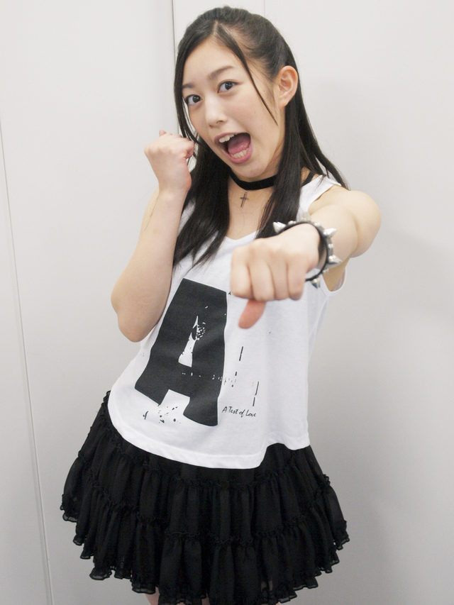 まい「ひめキュンの親指姫、まいまいこと、岡本真依です。よろしくお願いします! 6月に16歳になりましたっ! 私のチャームポイントは……、目力ですっ! 普段自分で言わないから照れます(照)」
