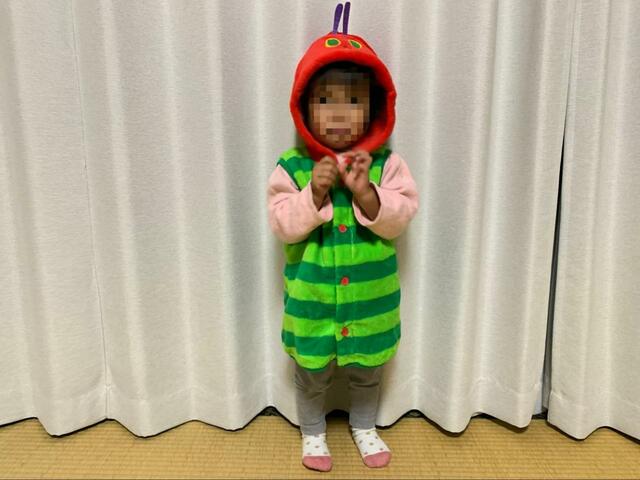 帽子好きな1歳の三女には、「はらぺこあおむし」のフード付きの着ぐるみベストを選びました。黄緑色と緑色の縞模様に赤いボタンやりんごのモチーフがあしらわれ、あおむしのお顔のフードの赤色も相まってとても目立ちます。