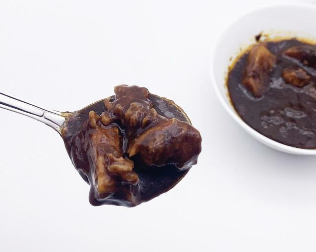 こちらもレンチンまたは湯煎していただくビーフシチューですが、程よい粘度のソースに牛肉がしっかり浸かっていることがわかります。