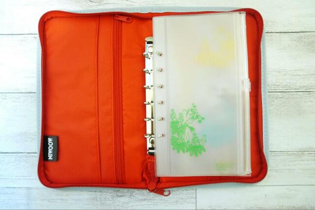 中は鮮やかな赤色。左側には縦長のポケットとファスナーつきのポケット、中央には6穴バインダー、右側にはカードポケットが4つあります。