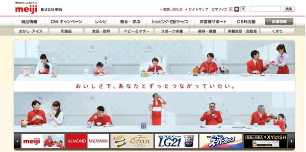 ミルクチョコレート、きのこの山、たけのこの里、チェルシー、キシリッシュなどでおなじみの明治。