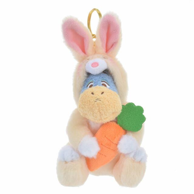 ピンクのウサギになったプーさんのぬいぐるみとぬいぐるみキーチェーンです。