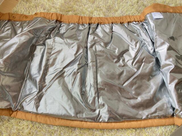 保温性の高いアルミプリントのおかげで、もも、おしりをポカポカに暖めてくれます。中わたも入っているので熱を逃がしません。