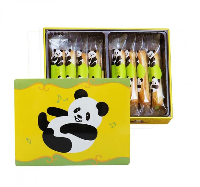 缶の側面には、パティシエパンダがクッキー作りに奮闘している姿を描いています。お菓子作りに奮闘するパンダの姿が可愛らしい、お手土産やお子様への贈り物にオススメな商品です。