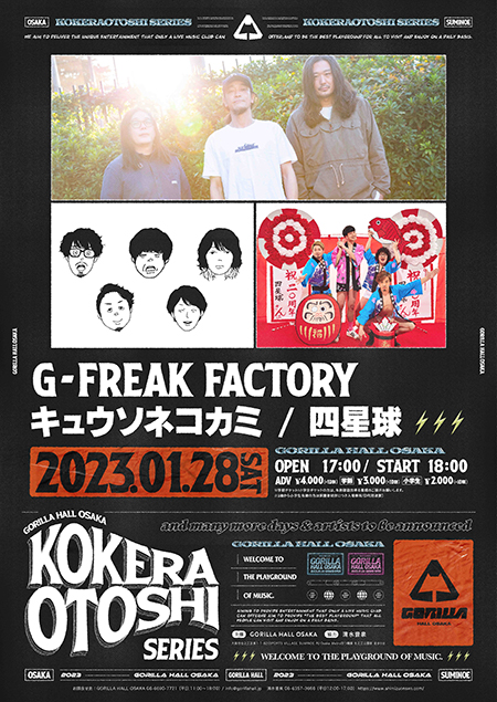 1月21日(土)大阪市住之江区に、“最高の遊び場を”をコンセプトにしたライブハウス「GORILLA HALL OSAKA」がオープンする。翌22日(日)からは柿落としシリーズが続々と開催! 1月28日(土)公演に、G-FREAK FACTORY、キュウソネコカミ、四星球の3組が出演する。