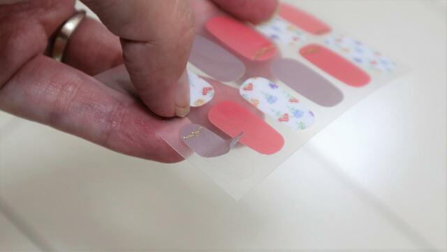 シールを爪の先端に被せるように密着させ、余分な部分をやすりで削ってください。