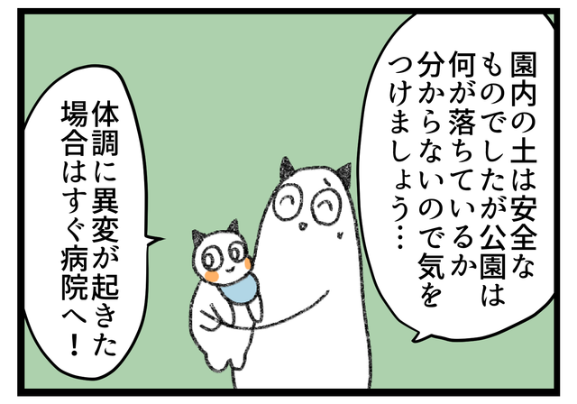 保育園では危険なものは土に含めていないということだったので安心しましたが、一応その日は異変がないか様子を見ました。