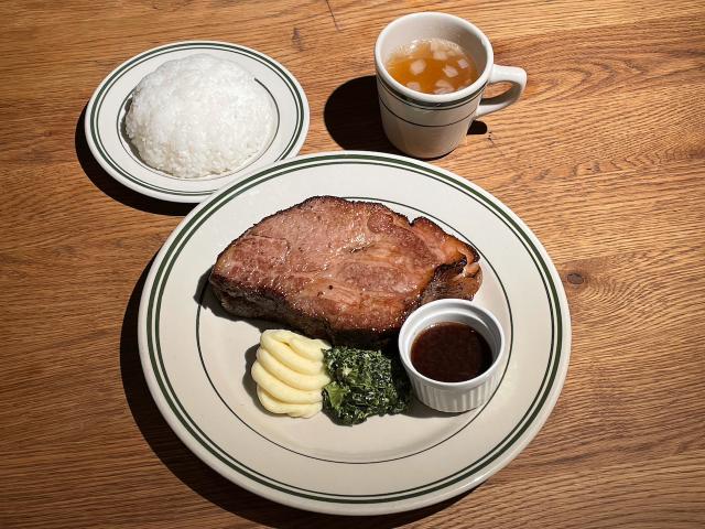 ステーキは塩コショウが一番うまいと思ってきた。けれど、この店のステーキソースはなかなか。やや甘く、ステーキがよりいっそうおいしく感じられた。