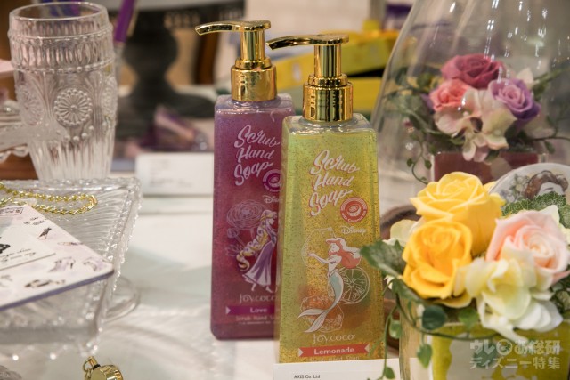 天然のスクラブ入りで頑固な汚れもすっきり洗えると人気の「ジョイココ」のスクラブハンドソープ(3月発売予定)も、アリエルとラプンツェルのデザインが展示されていました。