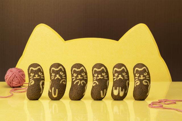 ふかふかのスポンジケーキがココアで黒猫カラーに変身! 中のクリームはチョコバナナカスタード味です。全ては“ぶにゃんこ”による、おいしいイタズラです。