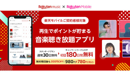 期間中、Rakuten UN-LIMIT VII契約者が特設サイトから「楽天カード/モバイル会員対象プラン」(ウェブサイトからの申し込みで通常月額780、)を選択してキャンペーンコードを入力してはじめてRakuten Musicを申し込むと、180日間無料で利用できる。無料期間終了後も月額980円の「月額スタンダードプラン」と比較して毎月200円おトクとなる。