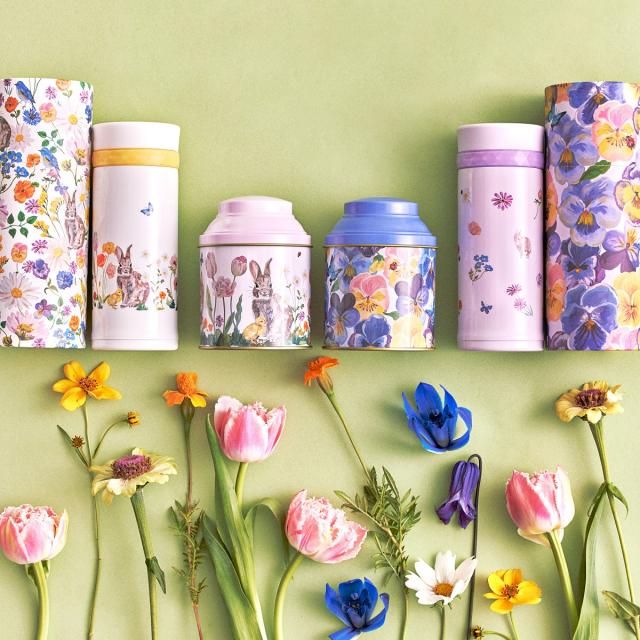 【Afternoon Tea】サーモスボトル200ml(イエロー/パープル) 各¥2,640、紅茶缶(イングリッシュブレックファスト/アールグレイ) 各¥1,296