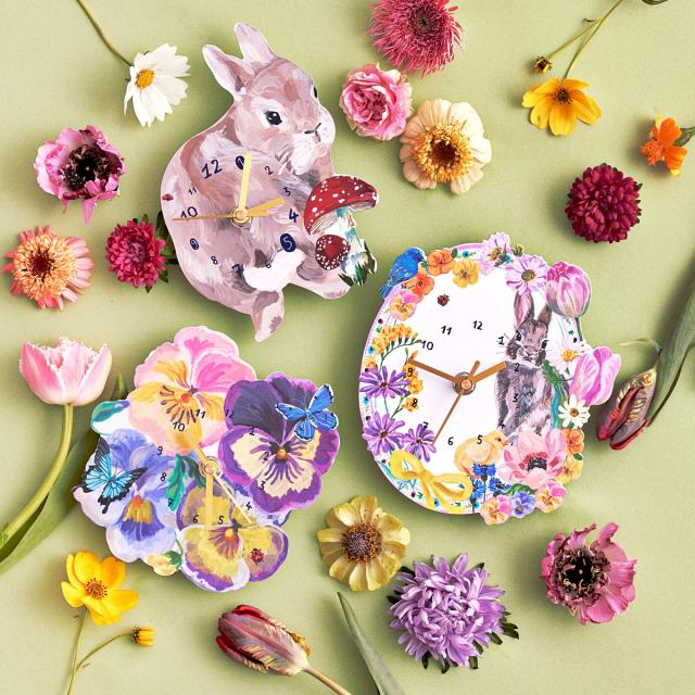 うさぎやきのこ、お花などが可愛らしくも華やかな掛け時計。
