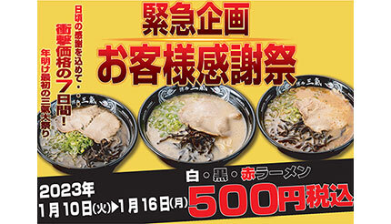 とんこつラーメン専門店「博多三氣」、「白・赤・黒ラーメン」を500円て提供する「お客様感謝祭」を開催