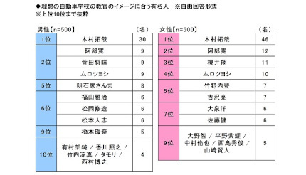 理想の自動車学校の教官のイメージに合う有名人を尋ねた質問では、男女とも「木村拓哉さん」(男性30名、女性46名)が他を大きく引き離して1位となっている。男性部門では、2位に「阿部寛さん」「菅田将暉さん」「ムロツヨシさん」(いずれも9名)、女性回答では2位に「阿部寛さん」(12名)、3位に「櫻井翔さん」(11名)がランクインした。