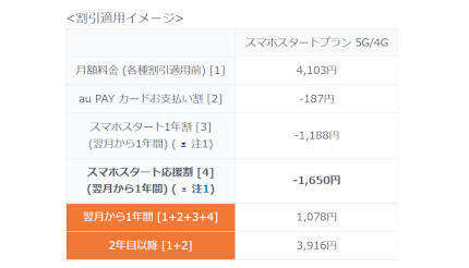 「スマホスタートプラン 5G/4G」「スマホスタートプランライト 5G/4G」は、スマホをはじめて利用する人を対象にした新料金プラン。さらに22歳以下なら、「スマホスタートプラン 5G/4G」の月額料金を1年間、月々1650円割り引く「スマホスタート応援割」を適用。「スマホスタート応援割」「スマホスタート1年割」「au PAY カードお支払い割」をすべて適用すると、加入翌月から1年間は月額1078円で月間20GBのデータ容量を利用できる。