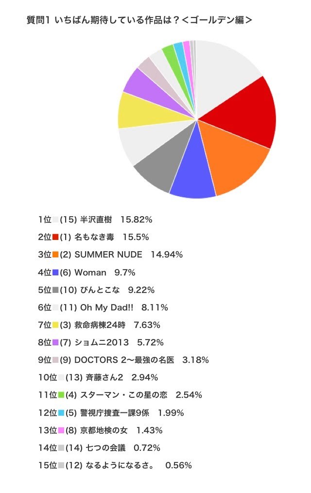 夏ドラマのリサーチは6月27日から行なっていたが、ドラマが始まる前の7月2日時点でのランキングでもっとも期待されていた作品は、TBS系日曜9時の『半沢直樹』。現在の投票ランキング [ https://ure.pia.co.jp/articles/-/15074/votes ] でも1位で、その支持率は15.82%から19%以上まで上昇している。視聴率も第7話でついに30.0%超え(ビデオリサーチ社調べ・関東地区)。