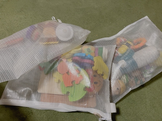 細かいおもちゃをたくさん入れても、ファスナーを閉めれば散らばりません。蓋のついたボックスでもいいような気もしますが、場所を取るし、蓋を無くしがち、というデメリットがあります。
