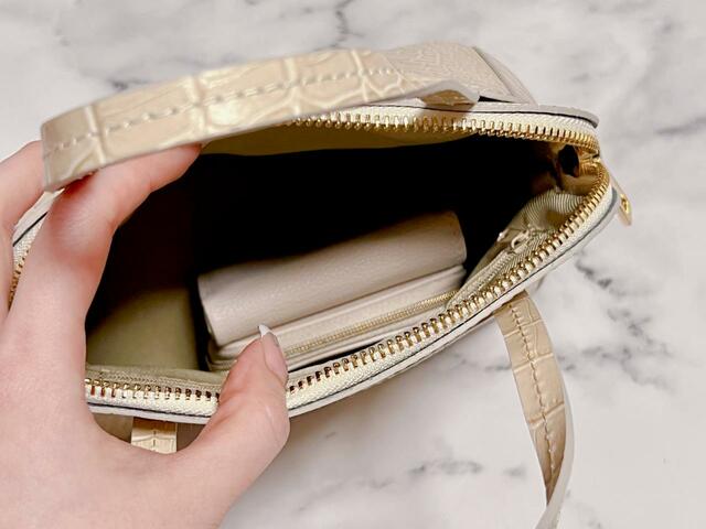 ミニウォレットは特に小さなバッグのときに活躍するので、手持ちのミニバッグに入れてみましたがコンパクトに収まりました。