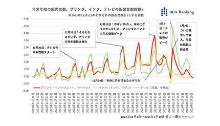 毎年、年末に慌てるのが年賀状だ。気が付くと年が明けたりしている。まずい。慌ててコンビニに走り、出来合いの年賀状を買って送る手もある。しかしそれでは、いくら何でも間に合わせ感が半端ない。やっぱりオリジナルだ。印刷だ。年に数回しか登場しないプリンタを引っ張り出す。試し刷りしようとすると、いかん。インク切れだ。インクを買いに走る。今度こそ試し刷りだ。だめだ。色がおかしい。インク詰まりだ。修理している暇はない。背に腹は代えられない。プリンタを買うぞ……。そんな行動パターンを定期的に繰り返しているような気がする。年末年始、年賀状のために人々はいつプリンタやインクを買っているのだろうか。全国2300店舗の実売データを集計するBCNランキングで、2022年の年末から年明けまでの動きを明らかにした。