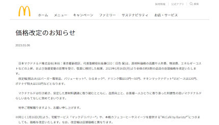 日本マクドナルドは、1月16日から約8割の品目の価格改定を実施する。改定による値上げ額(税込)はバーガー類単品、バリューセット、ひるまック、ドリンク類が10円~50円、チキンマックナゲット15ピースが120円、ポテナゲ特大が150円。ただし、空港・駅・遊園地・サービスエリア内など、約40店舗では店頭価格や改定幅が異なる。