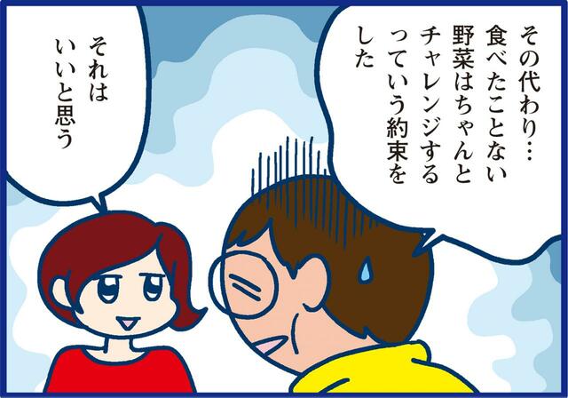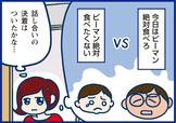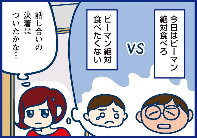 突然「ピーマン食べろ」といい出したノダD…。さるころが間に入らずに、子どもと父親で話し合いをしてもらった結果…結局事前に話し合いも何もせずに強硬手段に出たノダDは、息子の強固な反対にあい、結局折れていました。