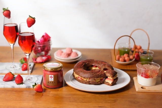 新商品には、フランスの伝統菓子「パリブレスト」のほか、自家製いちごジャムを練り込んだ「パウンドケーキ」、いちごさん果汁を使用した蜜をコーティングした「かりんとう」などがラインナップ。
