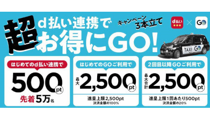 さらに、GOアプリの支払い方法にd払いを設定したうえでタクシーに乗車し、初めて決済を完了した人を対象にdポイント(期間・用途限定)を最大2500ポイント進呈する。加えて、2回目以降の決済となる人には最大で合計2500ポイントを進呈する。