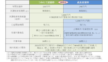 新たに非課税保有限度額(生涯非課税限度額)が設定され、総額1800万円まで非課税(うち成長投資枠は1200万円まで)となる。上場株式や投資信託などを対象とした成長投資枠の年間上限額は240万円で、フルに投資をし続けると5年で上限に達する。ただし、従来は売却しても投資枠は戻らなかったが、新NISAでは簿価残高方式で管理し、枠の再利用が可能になる。なお、成長投資枠は、「一般NISA」そのままではなく、高ビバレッジ型や毎月分配型の投資信託など一部は除外される。対象年齢は18歳以上。