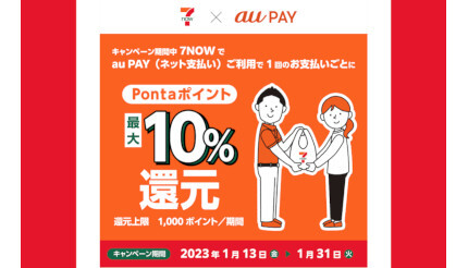 7NOWとau PAYでは1月13~31日の期間、セブン‐イレブンのネットコンビニ「7NOW」でau PAY(ネット支払い)を使って支払うと、1回の支払いにつきPontaポイントを最大10%(20ポイント/200円)還元するキャンペーンを実施している。期間中のポイント還元上限は、1au IDあたり1000ポイント/期間となる。