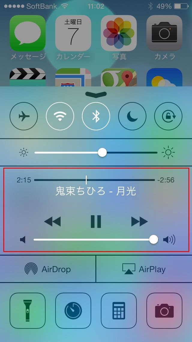 音楽コントロールもここにありましたが、iOS 7からは音楽コントールは新しく追加された「コントロールセンター」に格納されています。