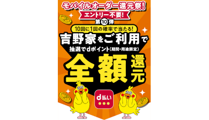 NTTドコモは、「d払い(モバイルオーダー)還元祭第10弾吉野家抽選で全額ポイント還元キャンペーン!」を実施している。期間は2月5日まで。