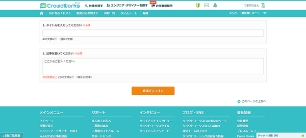 日記形式のテキストだし、文字量は300字程度と設定されていたので、10分も掛らずにテキストが完成。誤字脱字がないかを確認したら、「作業を完了する」をクリックしてお仕事終了です。