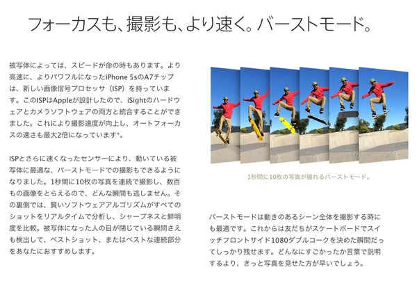 個人的にすごいなと思ったのが、カメラ機能です。CMOSのサイズを15%アップ。レンズのF値は2.2と、iPhone 5のF2.4よりも明るくなっています。