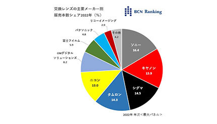 22年にシェアを拡大させたのがレンズメーカーのシグマとタムロンだ。年間シェアではシグマが14.5%で3位、タムロンが14.3%で4位と、0.2ポイントの僅差で激戦を繰り広げた。ソニー、キヤノンが販売本数でわずかに前年を割れたのをしり目に、シグマは126.3%、タムロンは136.2%と販売本数前年比が大幅増で好調だ。ミラーレス一眼用レンズの構成比もソニーに次いで高く、シグマが72.6%、タムロンは85.9%を占める。自社のカメラ用レンズしか販売できないカメラメーカーに比べ、レンズメーカーは、複数社のボディ向けレンズを販売できる。よりミラーレス化に対応しやすいという点で有利だ。