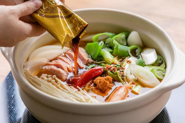 辛ラーメンをメイン食材として使う鍋のため、とことんこだわって開発したという特製プデチゲヤンニョムは、厳選したコチュジャンと新鮮なニンニク、さまざまな野菜の旨味やネギ、ゴマ油をブレンドし、深みのある味わいを表現しています。