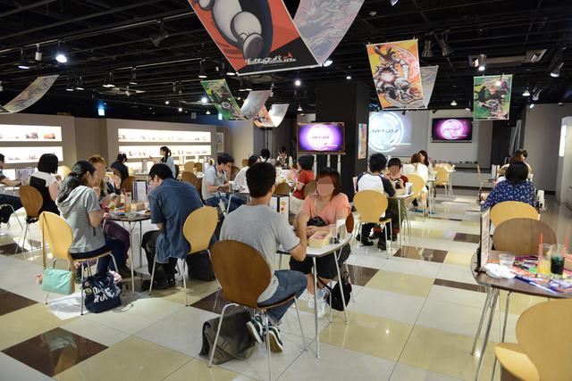 店内は広々とした空間にテーブルが並んでおり、BGMはもちろんダンガンロンパ! 前方には大きなモニターがあり、ここにはアニメのOPなどが映し出されています。大本さんはまず店内をぐるりと一周。並べられたダンガンロンパグッズを見て「ダンガンロンパグッズってこんなにたくさんあるんですね!」を目を丸くしていました。