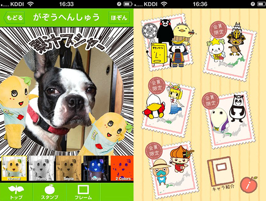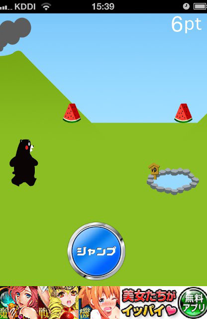 ボタンをタップすることでくまモンをジャンプさせながら、熊本県の名産品をゲットしてポイントを集めるゲーム。温泉に入るとおさんぽ終了。
