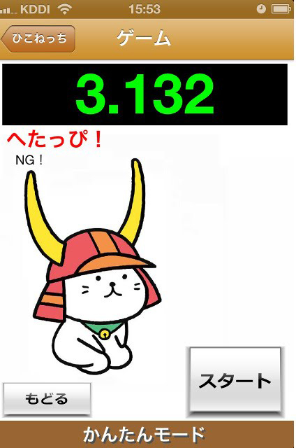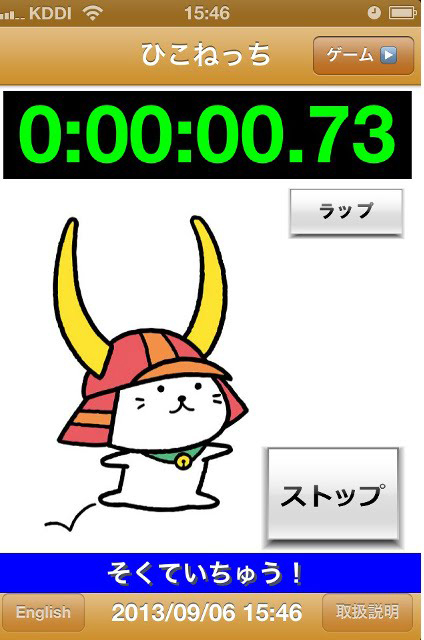 ストップウォッチモードは、屈伸したひこにゃんが、スタートするとびよんとジャンプしたポーズに早変わり。